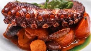 Polvo à Lagareiro: Tender octopus first boiled and then roasted with generous amounts of olive oil and garlic, traditionally served with "punched" potatoes (batatas a murro).